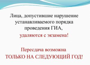 Кроме того, во время экзамена учащиеся не должны общаться друг с другом, свободно перемещаться по аудитории ППЭ. При установлении факта нарушения учащимися установленного порядка государственной итоговой аттестации, уполномоченный представитель ГЭК удаляет их с экзамена и составляет соответствующий акт. Результаты, полученные лицами, удаленными с экзамена, аннулируются решением председателя ГЭК без предоставления им права пересдачи экзамена в текущем году. По факту административного правонарушения составляется протокол. Лица, нарушившие порядок проведения государственной итоговой аттестации, привлекаются к административной ответственности, предусмотренной статьей 19.30 КоАП. Кроме того, административная ответственность установлена для участников государственной итоговой аттестации, разместивших КИМ в сети Интернет, по статье 13.14 (разглашение информации ограниченного доступа) и статье 19.30 (нарушение установленного порядка проведения) КоАП